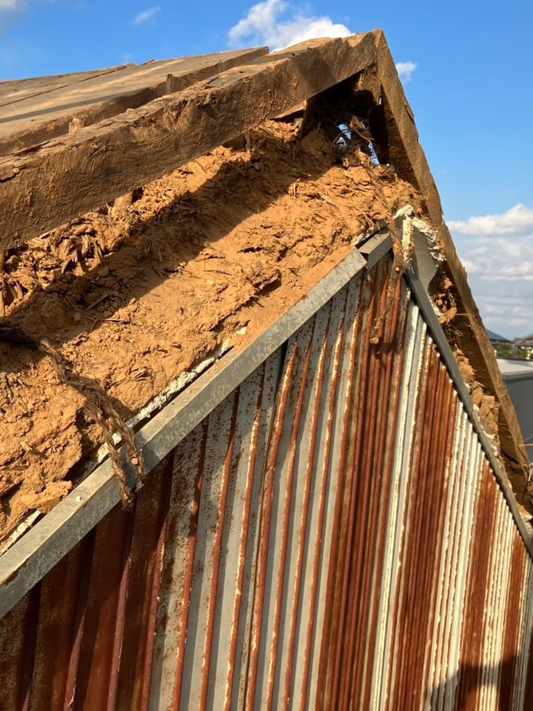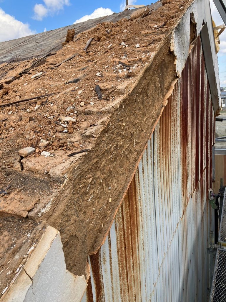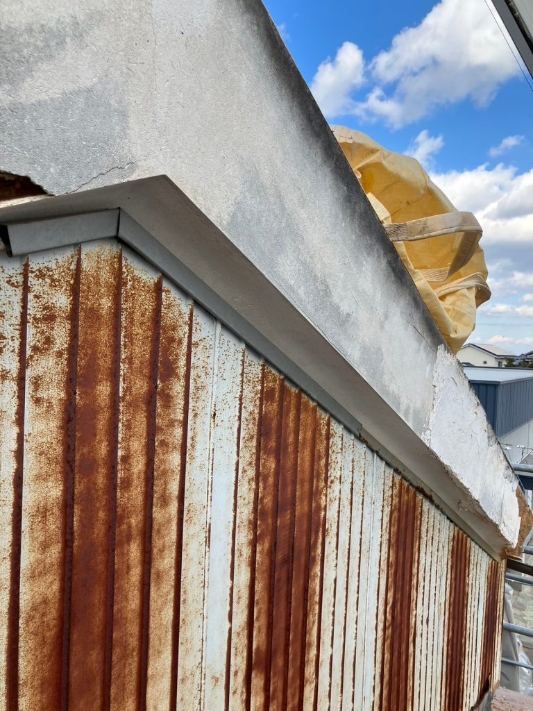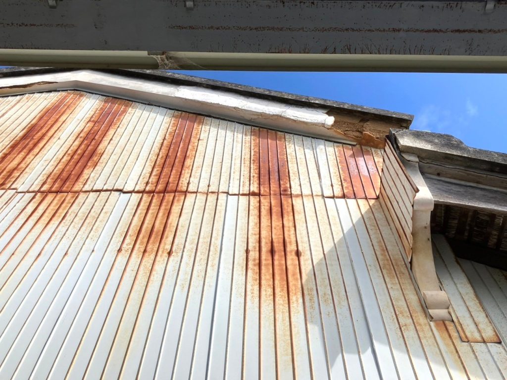 外壁の錆や破風の漆喰の劣化が見られます。