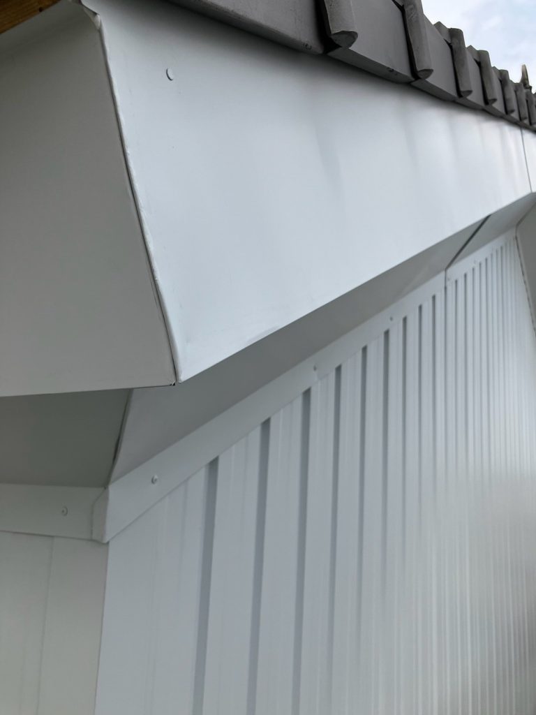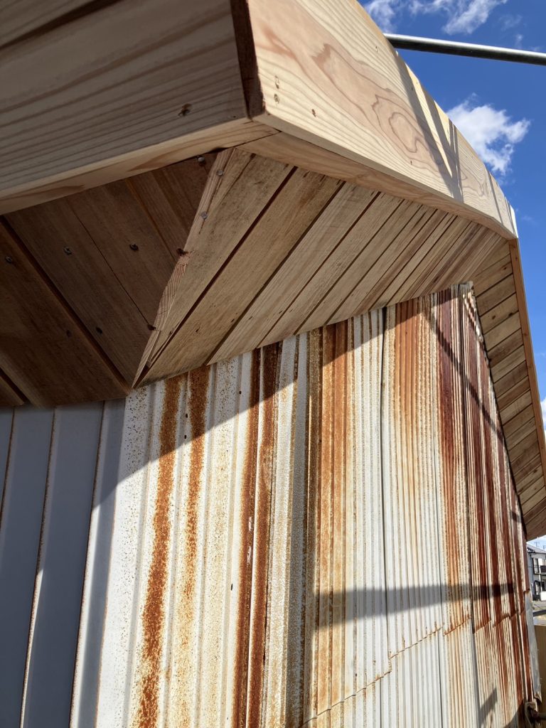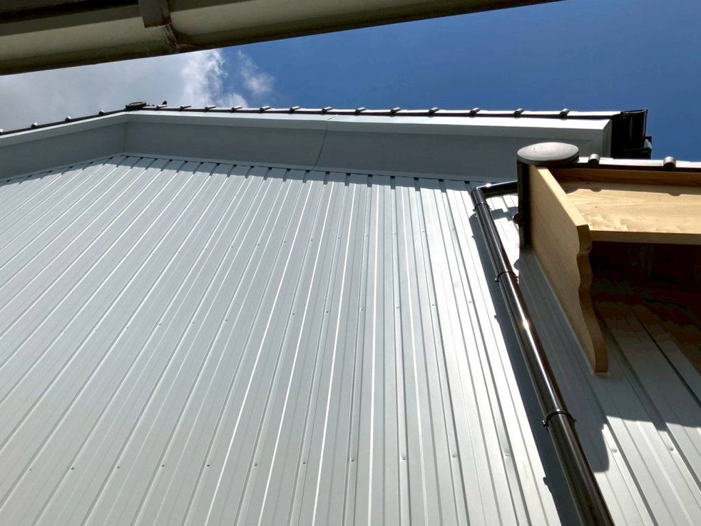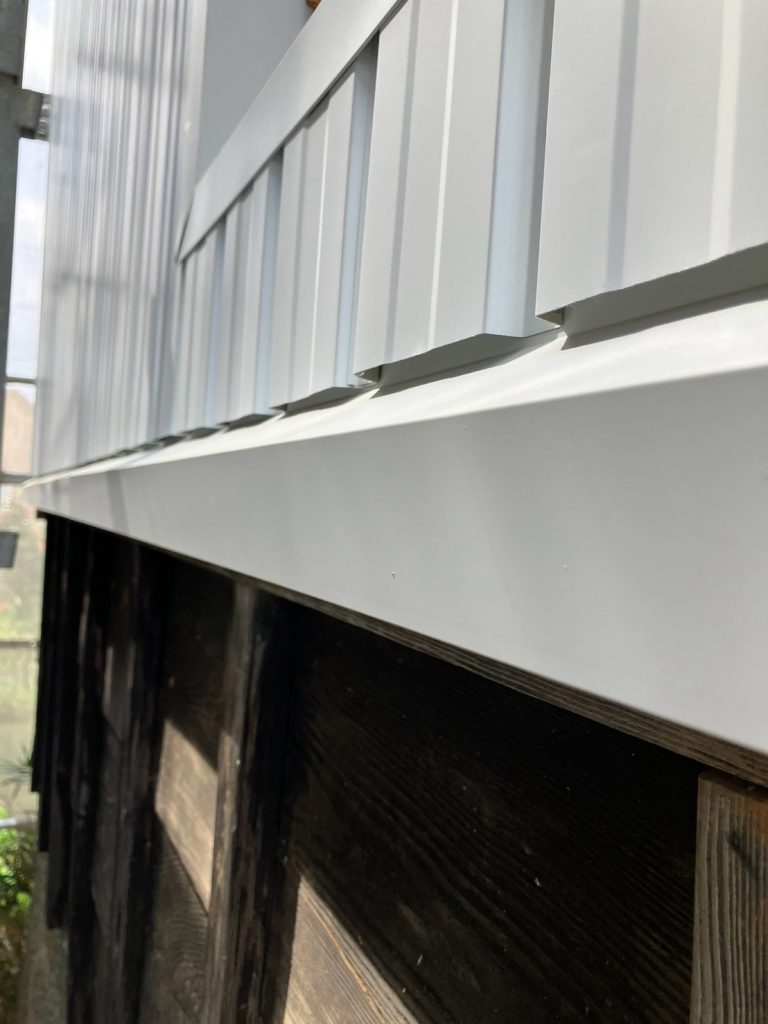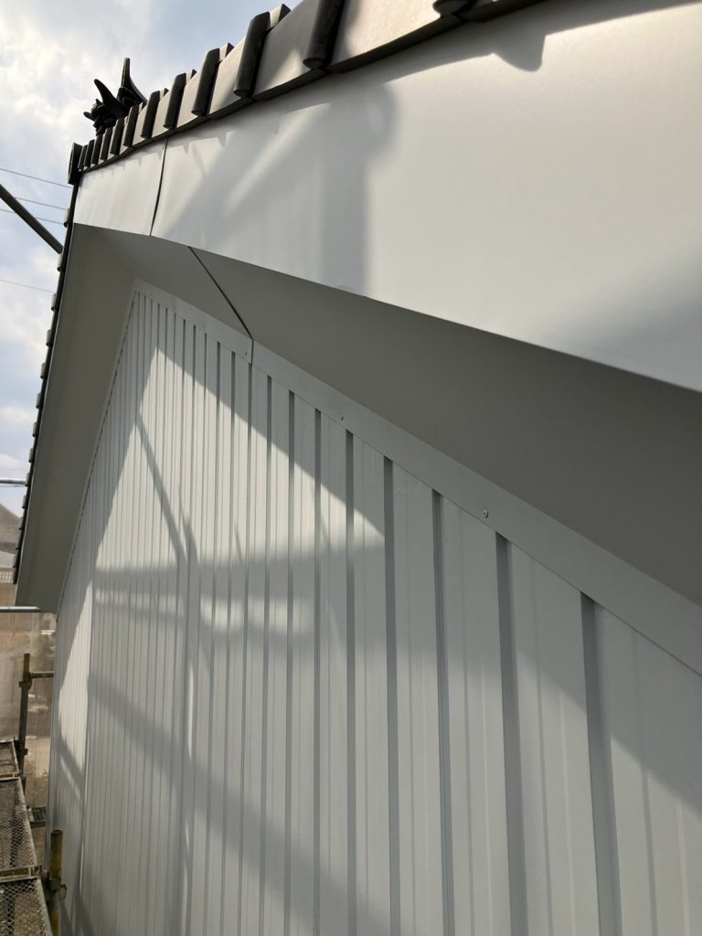 ↑ その上に、ガルバリウム鋼板の役物を取付けて、破風の工事完了です。