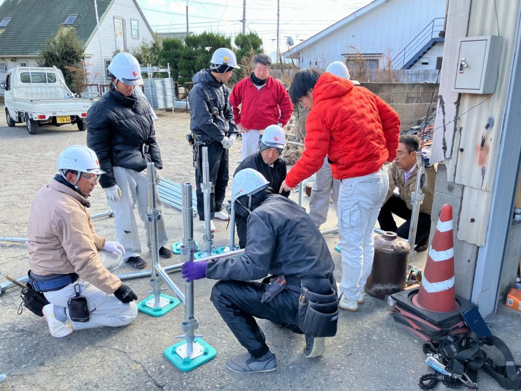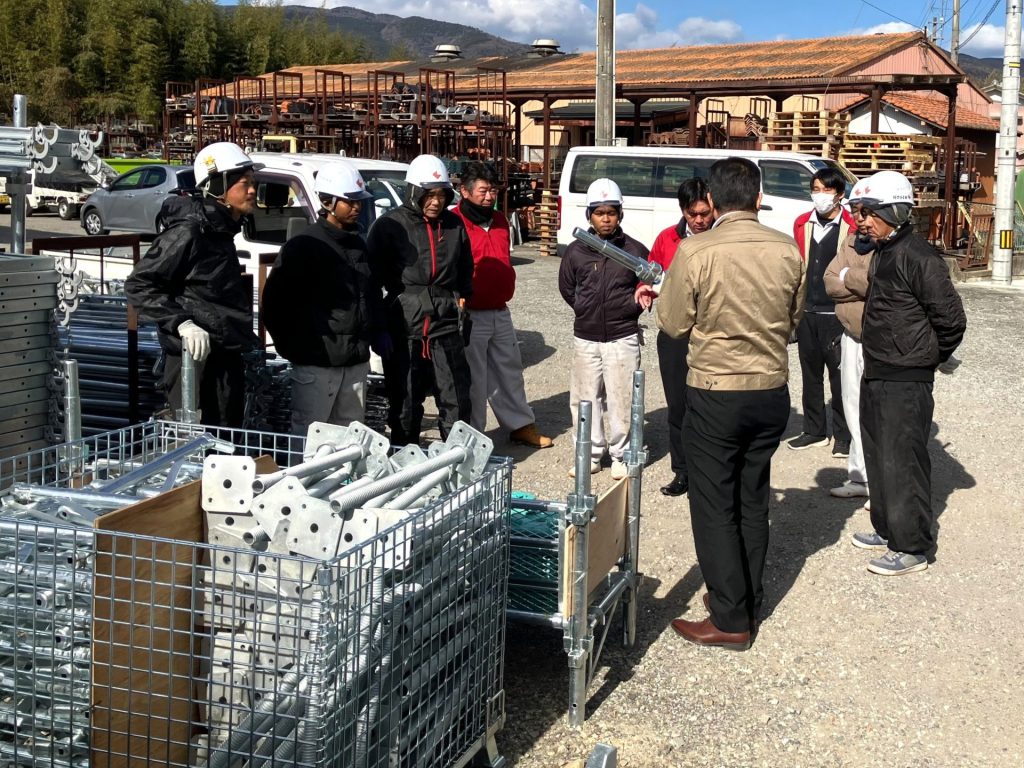 足場メーカーの担当者を講師に招き、架設方法について教えていただきました。